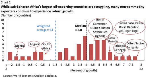 Yet, the report shows the full picture of sub-Saharan Africa is one of multispeed growth in which regional aggregate numbers hide considerable diversity in economic paths across countries (see chart 2).