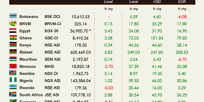 Botswana | BSE DCI | 10,612.68 | +0.02 | +5.61 | +4.27 | -6.35 | 06-Oct  |